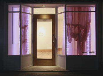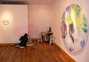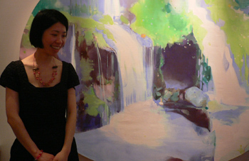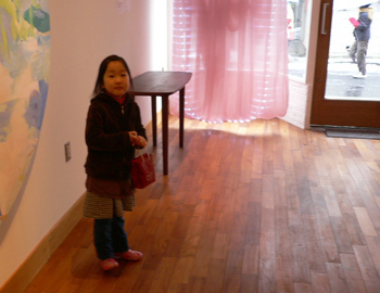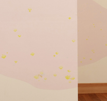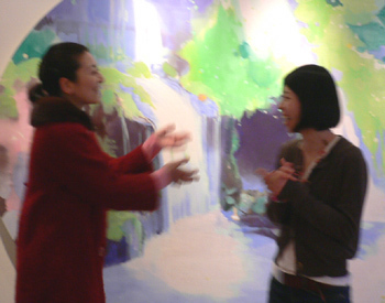 へばりつき、壁の滝壺をイメージしたピンクに、これまでに来て下さった人々