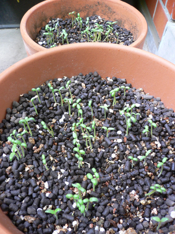 見事発芽!。ビニールをかぶせ大事に温室にしたら、かわいい双葉がいっぱいです。