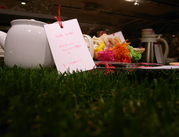 閉店後、設営あと。落ち綿フキンにアクリル糸のタッセル↑(束子にもなる)をアレンジ。